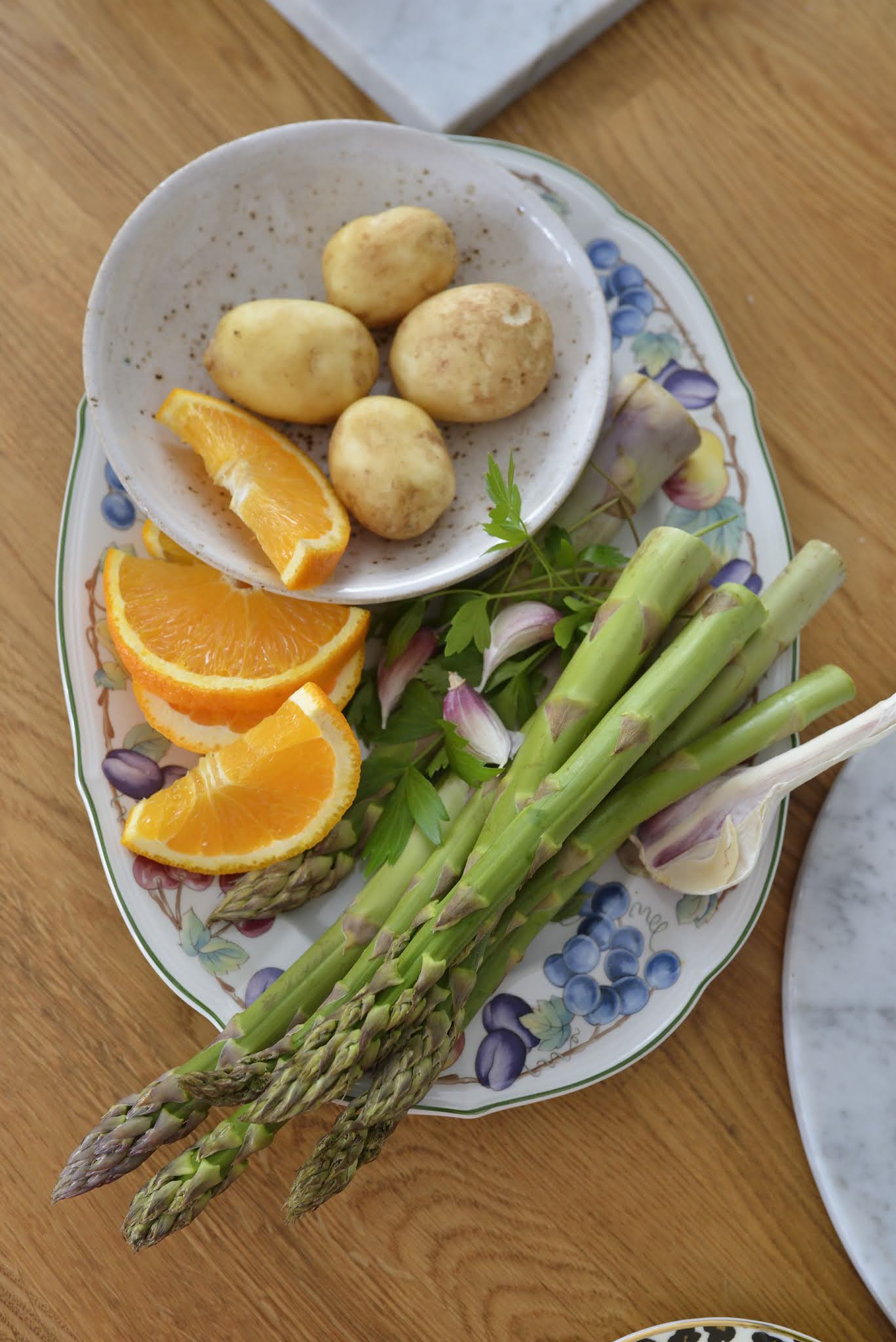 Dodaj nadzianą plastrem pomarańczy i ziołami tuszkę ryby, ząbki czosnku, szparagi. Całość zapiekaj ponownie (temp. 200°C, czas w zależności od wielkości ryby 8-10 minut)
